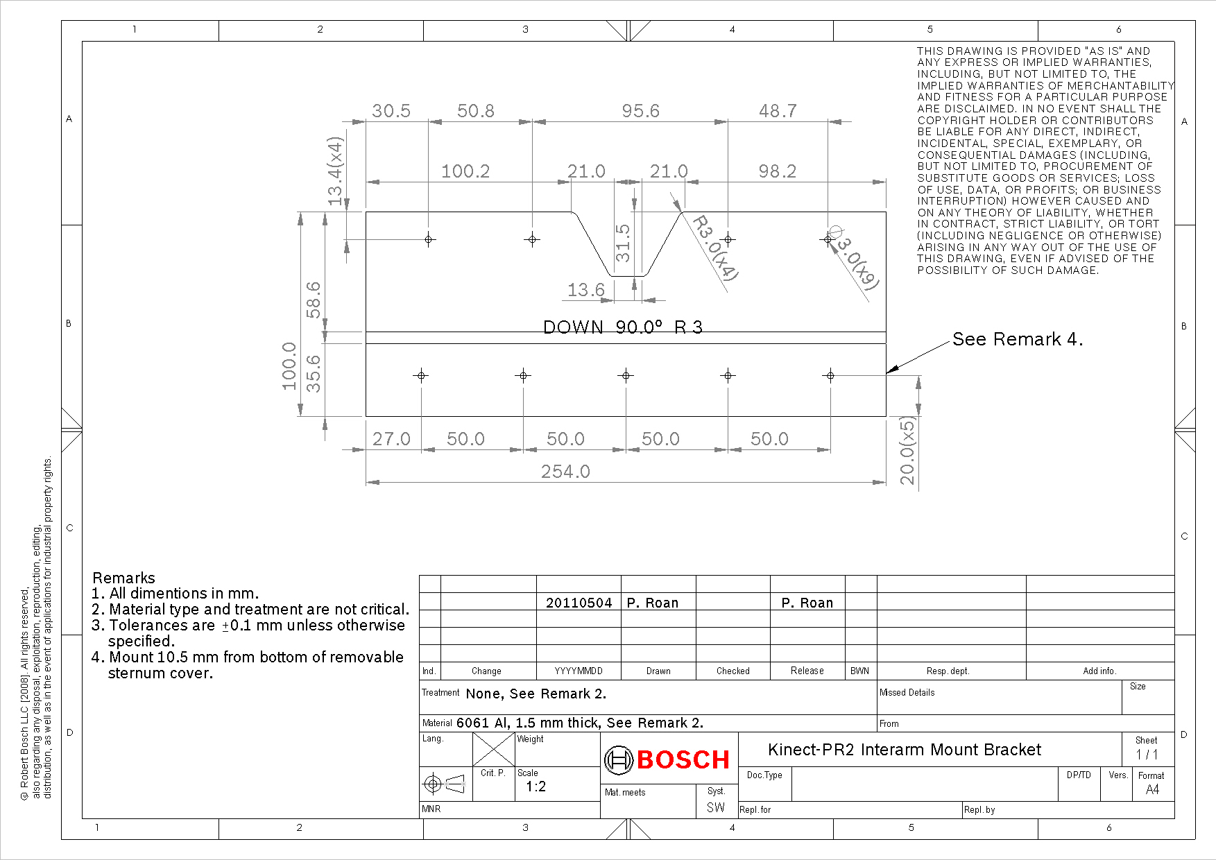 TUM: The sensor is mounted directly to the head via a mounting plate. An STL file for this mounting plate is available. Here KINECTMOUNT_jromano.dwg is a DWG autocad recreation of this mounting plate, useful for laser-cutting.